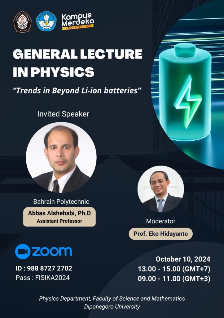 The Department of Physics, Faculty of Science and Mathematics, Diponegoro University, will be hosting an online General Lecture on the exciting topic of future battery developments. This event will take place via Zoom on October 10, 2024, from 13:00 to 15:00 WIB (GMT+7) or 09:00 to 11:00 Bahrain time (GMT+3).