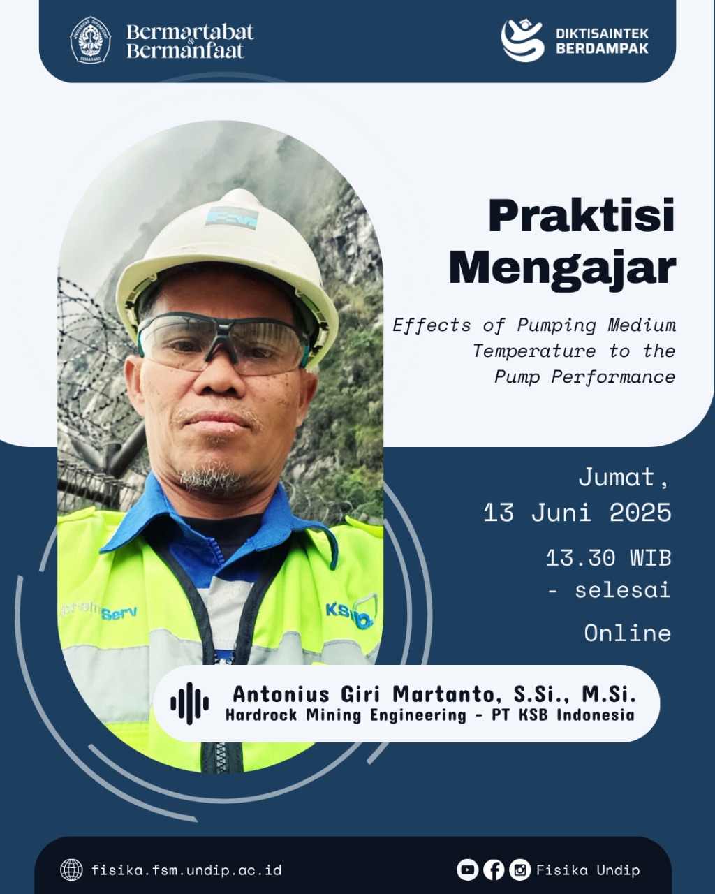 Semarang, June 13, 2025 – The Department of Physics at Universitas Diponegoro once again hosted its Praktisi Mengajar (Practitioner Teaching) program, aiming to strengthen the connection between academic theory and industrial practice. This session, titled “Effects of Pumping Medium Temperature to the Pump Performance,” featured a special guest speaker, Antonius Giri Martanto, S.Si., M.Si., a seasoned professional from PT KSB Indonesia specializing in industrial pump engineering.