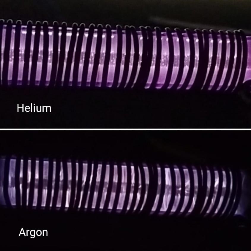 The principle of this technology starts with cosmic ray radiation to generate single electrons within a Dielectric Barrier Discharge Plasma (DBDP) reactor. These electrons are accelerated by a high electric field between two sharp electrodes and a small-diameter wire enclosed in a dielectric tube. The energetic electrons collide with atoms and molecules in the reactor. Physically, this must be analyzed through Quantum Scattering, a challenging topic in quantum mechanics. The goal is always to determine energy levels, wave equations, and scattering amplitudes. Atoms and molecules undergo ionization, excitation, dissociation, and emit photons through various quantum transitions (wavelengths). Collisions between plasma species in the ionized gas result in fascinating plasma phenomena and their glow. A photo of helium and argon plasma can be seen below. Imagine a darkening sky before rain suddenly glowing, followed by a thunderous sound—this is lightning. Lightning brings blessings, as it converts nitrogen molecules from the atmosphere into nitrates, nourishing the Earth. So, the 78% nitrogen in our atmosphere is a divine gift to humanity.