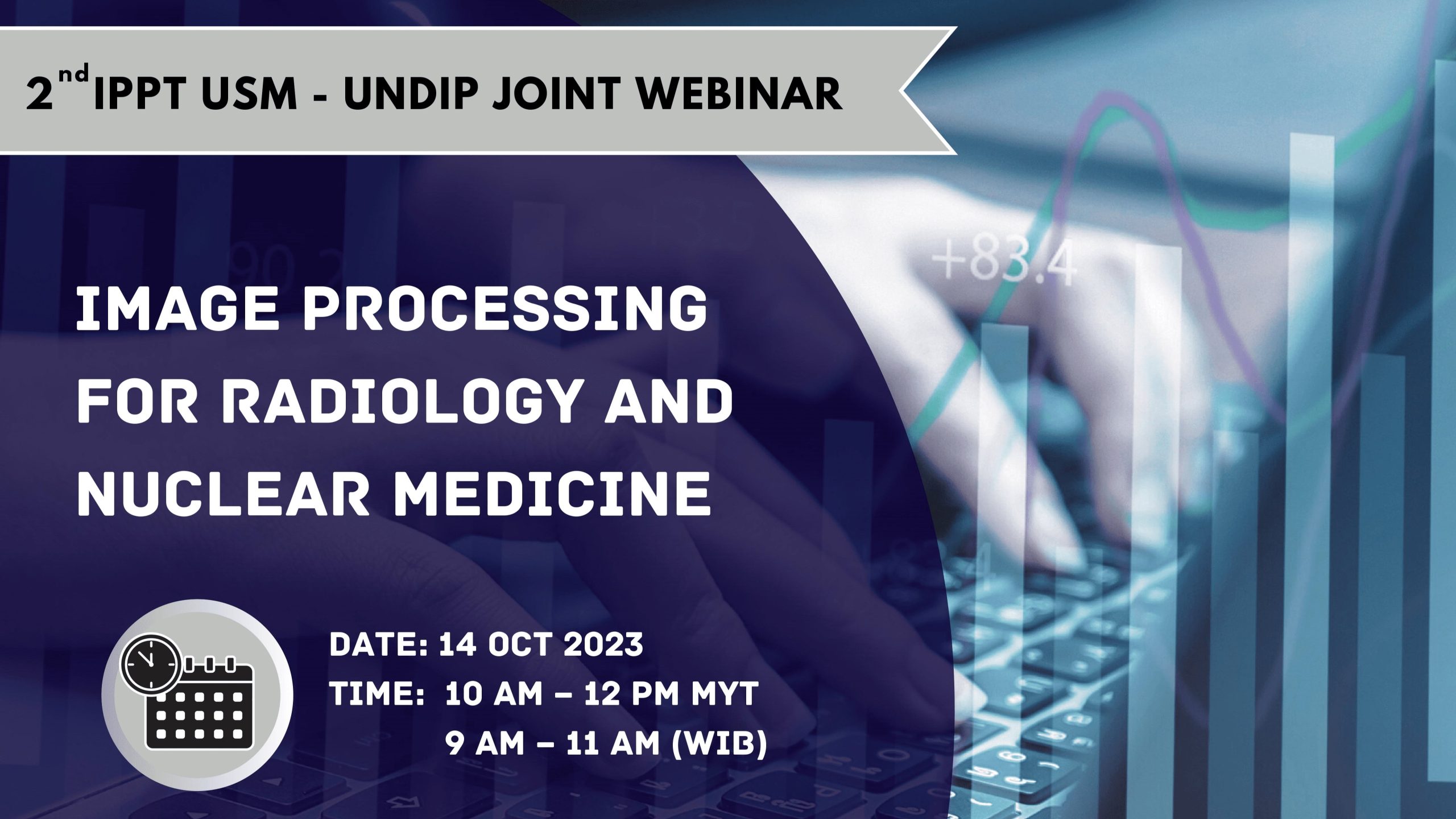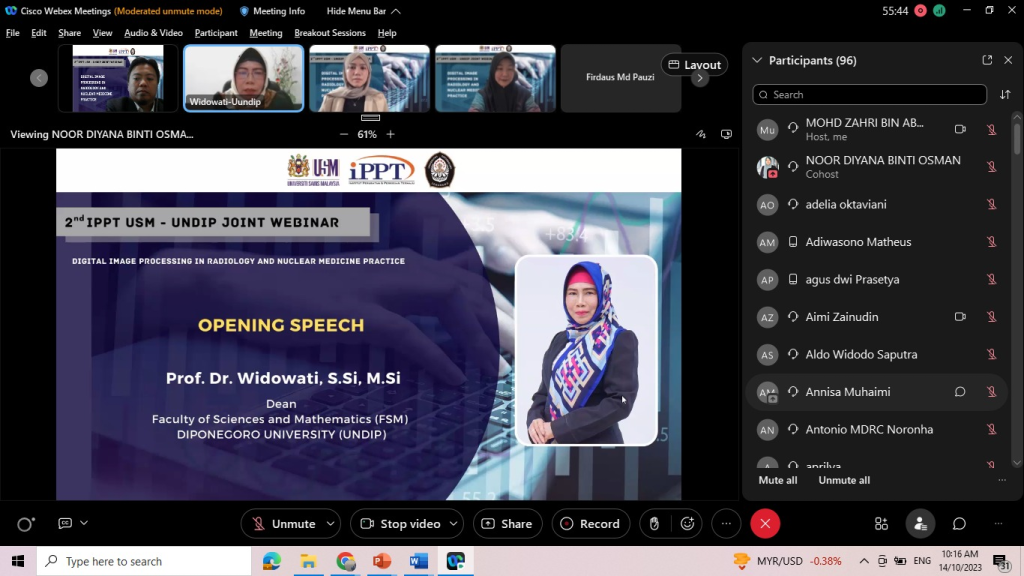 On Saturday, October 14, 2023, the second Joint Webinar between the Physics Department of the Faculty of Mathematics and Natural Sciences (FMNS), Diponegoro University (UNDIP) and the Advanced Medical and Dental Institute (IPPT), Universiti Sains Malaysia (USM) was held. This second Joint Webinar carried the theme: Image Processing for Radiology and Nuclear Medicine, featuring two experts from both institutions, Dr. Mohd Syahir Mansor (from USM) and Dr. Choirul Anam (from UNDIP). Dr. Syahir delivered a presentation titled: Towards PET/CT Precision in Oncology and Neurology Application, and Dr. Anam presented on the topic of Image processing on CT images for automatic image quality assessment. The Joint Webinar was moderated by Assoc. Prof. Dr. Mohd Zahri Abdul Aziz (from USM).