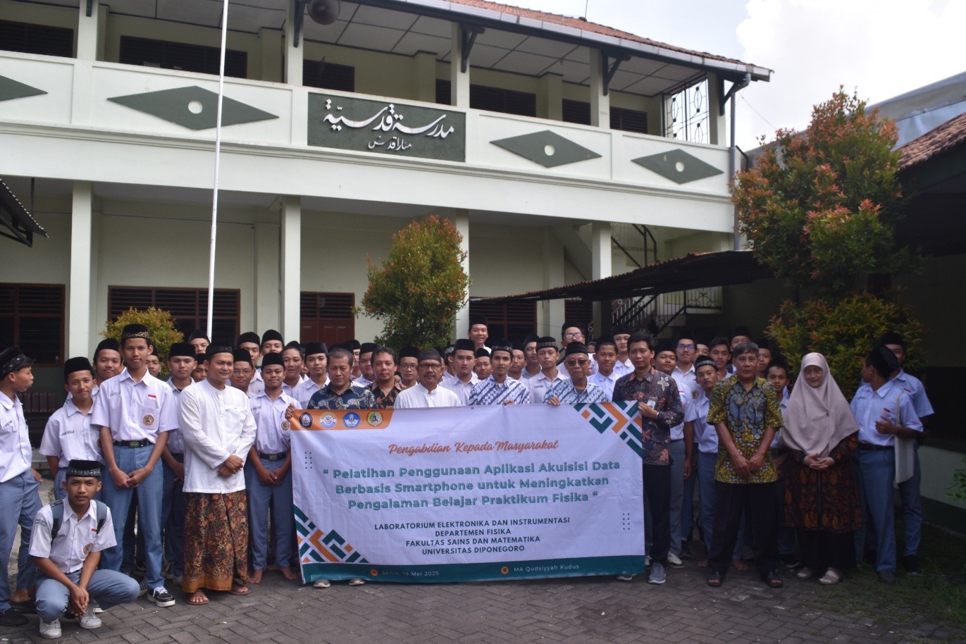 On Monday (May 19), the community service team consisting of Dhani Nur Indra Syamputra, S.Si., M.Sc., Heri Sugito, S.Si., M.Sc., Dr. Dra. Sumariyah, M.Si., Drs. Isnain Gunadi, M.Si., Jatmiko Endro Suseno, S.Si., M.Si., Ph.D., F.Med., Prof. Dr. Kusworo Adi, S.Si., M.T., and Prof. Dr. Drs. Catur Edi Widodo, M.Si., conducted a community service activity at Madrasah Aliyah (MA) Qudsiyyah in Kudus City, Central Java. The event carried the theme “Training on the Use of Smartphone-Based Data Acquisition Applications to Enhance the Learning Experience in Physics Practicum.” This topic was chosen to address students’ difficulties in accessing laboratory equipment during physics lessons.