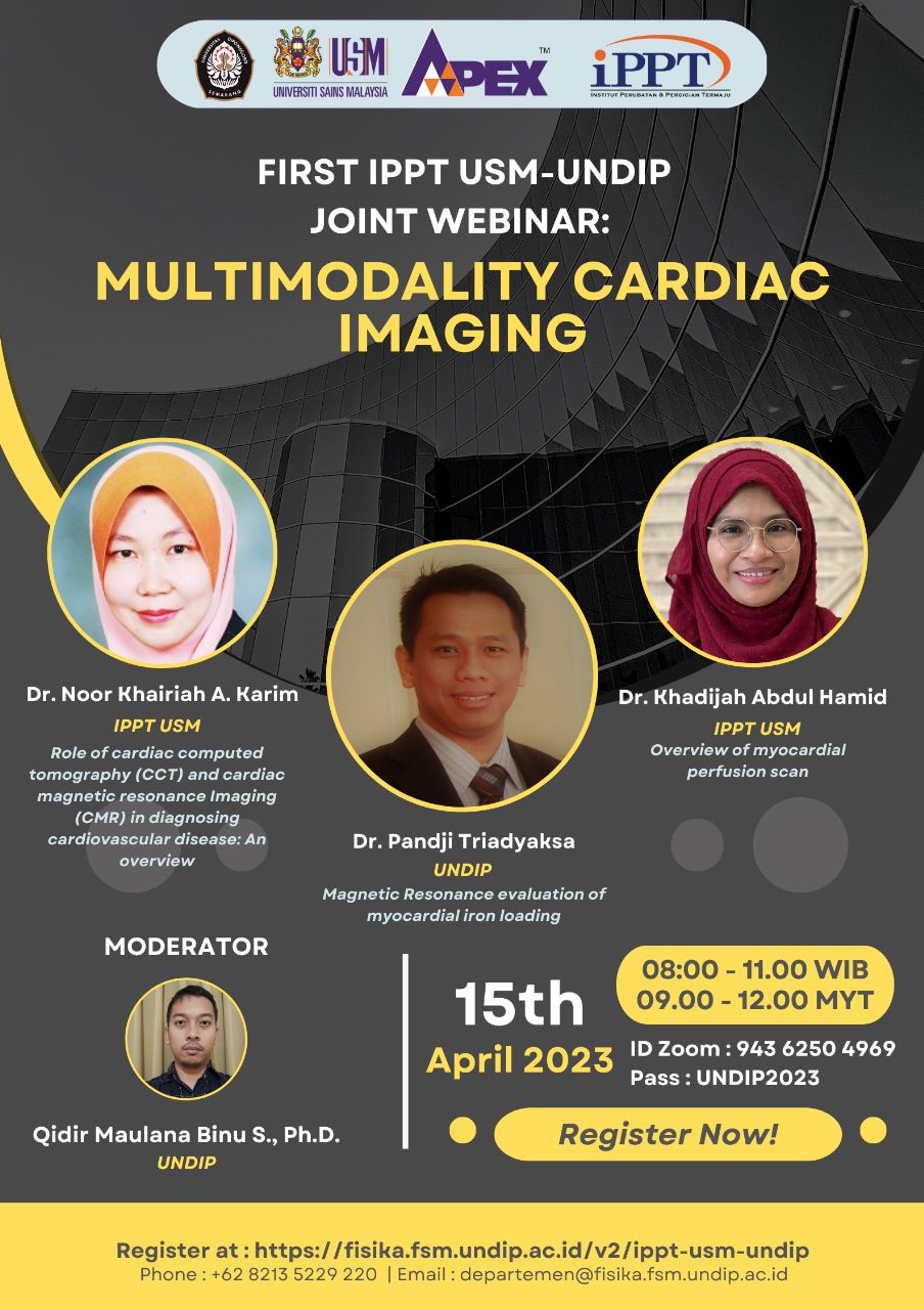 The first Webinar Series related to the collaboration between IPPT USM and UNDIP was held on April 15, 2023 with the theme Multimodality Cardiac Imaging. This webinar is attended by experts and medical practitioners from various countries who will share knowledge and experience about the diagnosis of cardiovascular disease with heart scanning techniques.