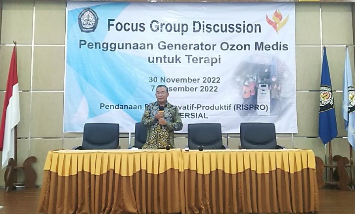 Prof. Dr. Muhammad Nur, DEA selaku ketua peneliti Pengembangan Generator Ozon Medis Berstandar untuk Pemenuhan kebutuhan Aplikasi Medis Nasional dengan pendanaan riset inovatif produktif (RISPRO)-Komersial LPDP, berkesempatan memberikan sambutan awal diskusi. M. Nur menyampaikan bahwa penelitian dibidang plasma sudah dimulai sejak 1999 dan pada kisaran tahun 2017 berdiskusi dengan kolega seorang dokter yang bercerita tentang teknologi ozon medis menggunakan generator ozon yang memiliki spesifikasi teknologi reaktor berpenghalang ganda (Double Dielectric Barrier Discharge-DDBD), dilengkapi pemusnah ozon, dan menggunakan oksigen murni sebagai bahan masukan gasnya. Teknologi DDBD digunakan agar tidak ada interaksi ROS dengan elektroda, sehingga tidak ada kontaminan yang ikut masuk kedalam luka. Pemusnah ozon sebagai Langkah solusi agar sisa ozon dalam “bagging” tidak keluar dan dimusnahkan menjadi oksigen. Hal ini untuk memastikan keamanan perawat dan juga pasien dari paparan ozon yang bersifat oksidatif. Sedangkan oksigen yang digunakan sebagai bahan utama pembentukan ozon menggunakan oksigen kelas medis. Hal ini sejalan dengan rekomendasi yang dikeluarkan oleh Komite Ilmiah Internasional Ozon terapi pada tahun 2020 di Madrid, Spanyol. Maka, rekomendasi standard generator ozon medis ini bisa dijadikan acuan bagi kita untuk mendorong agar generator ozon medis bisa memiliki aspek legal formal di Indonesia, tentu dengan komunikasi dengan berbagai elemen dan stakeholder yang berkaitan