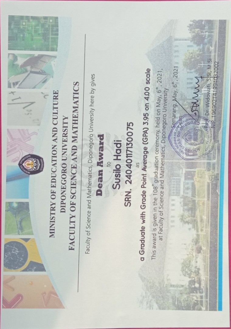 Susilo Hadi merupakan mahasiswa fisika Universitas Diponegoro angkatan 2017 yang berasal dari Grobogan, Jawa Tengah. Susilo yang merupakan alumni MAS (Madrasah Aliyah) Sunniyyah memperoleh gelar Sarjana Sains (S.Si.) dengan predikat Cumlaude dan mendapatkan Dean Award pada Yudisium Fakultas Sains dan Matematika yang ke-108.